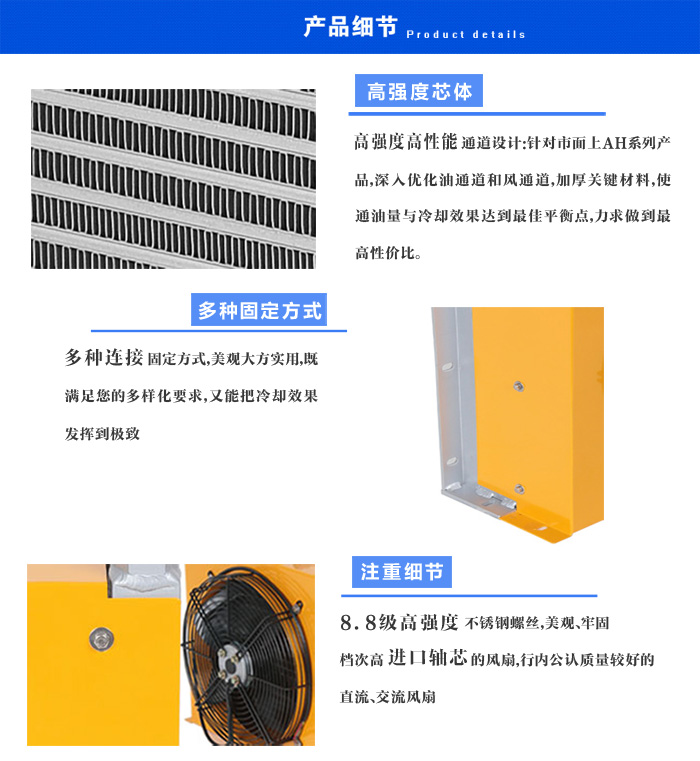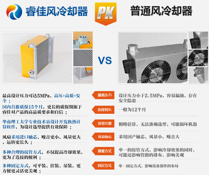 答:睿佳機(jī)械生產(chǎn)的液壓風(fēng)冷散熱器,適用低于160℃的流體溫度,適用環(huán)境溫度低于80℃。冷卻效率高,而且環(huán)保、節(jié)能、維護(hù)簡(jiǎn)單、運(yùn)行成本低。
